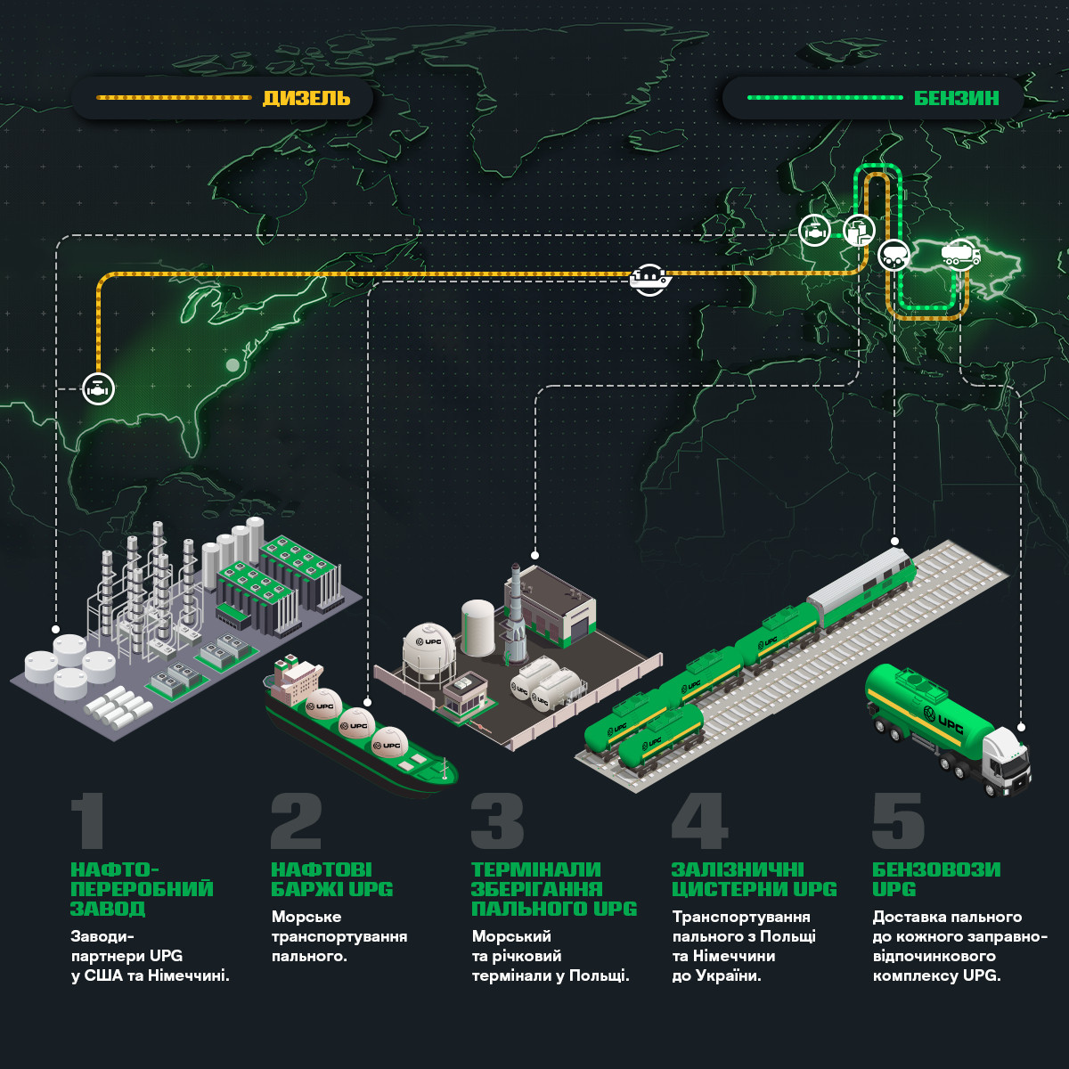 Перед тим як потрапити до вашого баку, пальне UPG долає довгий шлях у тисячі кілометрів водою, залізницею та суходолом. Компанія закуповує усю свою продукцію на високотехнологічних західних заводах. Їх пальне є одним із найякісніших у світі, менше шкодить навколишньому середовищу та дбає про захист автомобілів.