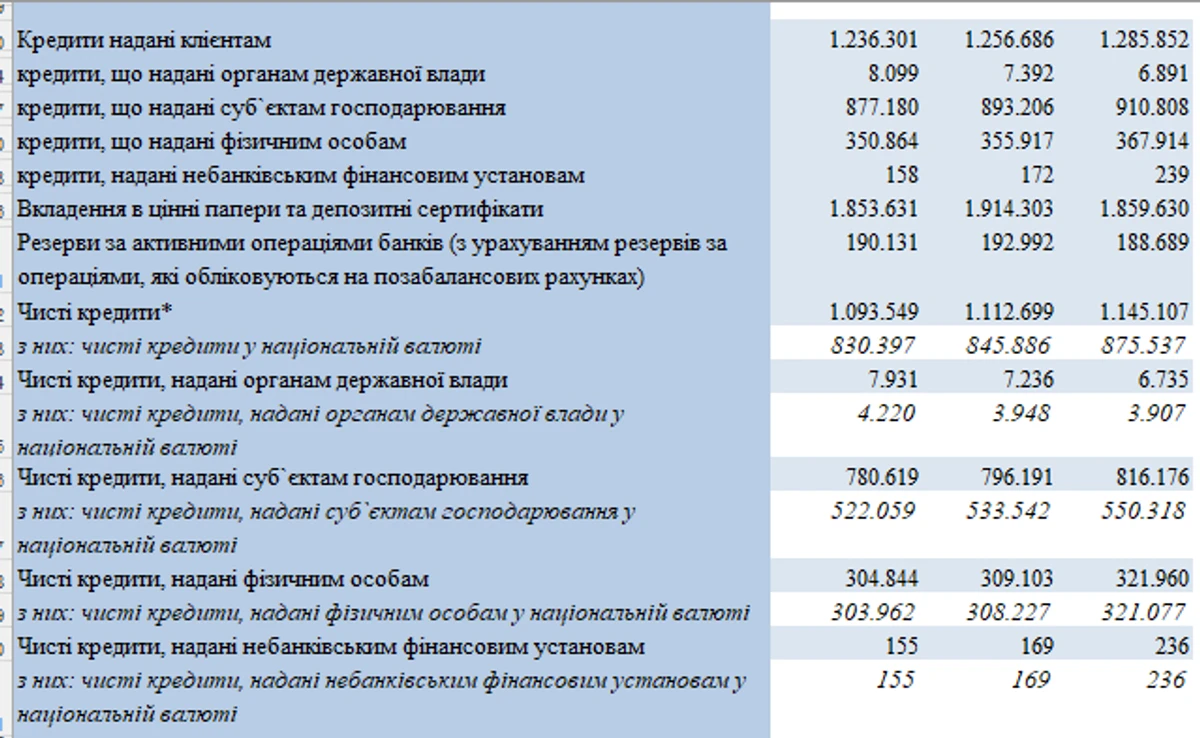 НБУ зазначає, що для коректної оцінки динаміки кредитування важливо аналізувати саме чисті кредити за наглядовою статистикою, адже валовий показник містить непрацюючі активи.
