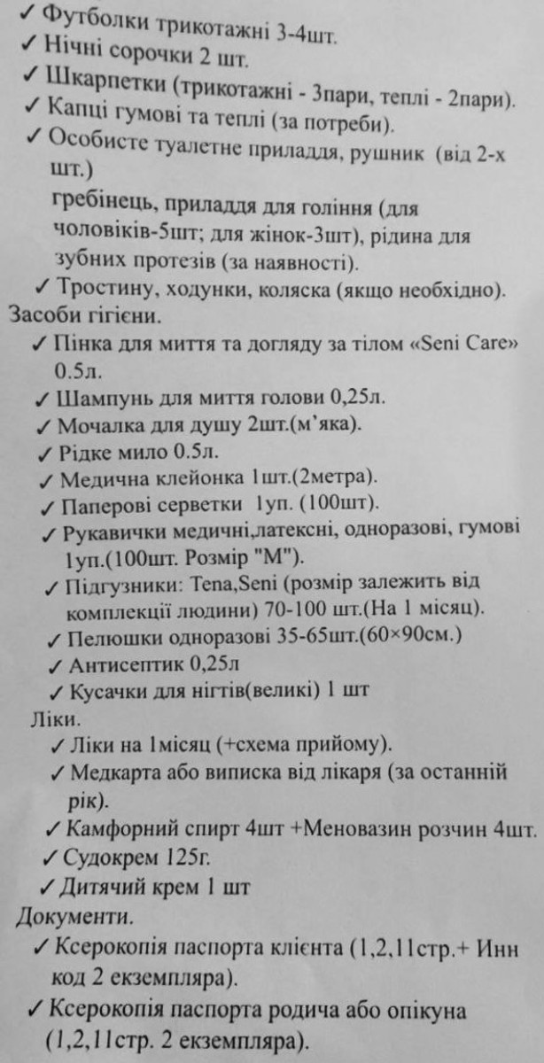 Перед оформленням тут видають список необхідних речей для мешканців. У ньому – зручний одяг на кожен день, теплі речі на випадок прохолодних вечорів, кілька пар взуття, засоби особистої гігієни. Окремий пункт – ліки, які приймаються постійно, та медичні виписки, щоб медсестра знала, який догляд потрібен.
