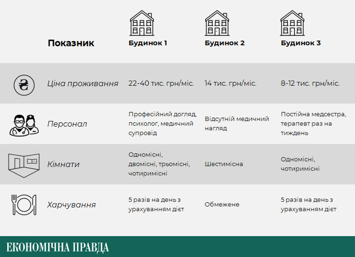 Якби в кожному з цих пансіонатів жили по десять людей, то перший будинок приносив би 300 тис. грн на місяць, другий – 140 тис. грн, третій – 120 тис. грн.