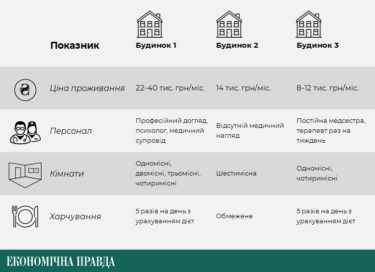 Так журналістка побачила три абсолютно різні моделі старості. У першій усе нагадує готель: доглянутий сад, психолог, п’ятиразове харчування за 40 тис. грн. У другій – тісні кімнати, відсутність медсестер і запах забуття за 14 тис. грн. У третій – людяність і домашня атмосфера без зайвої розкоші за 8-12 тис. грн.