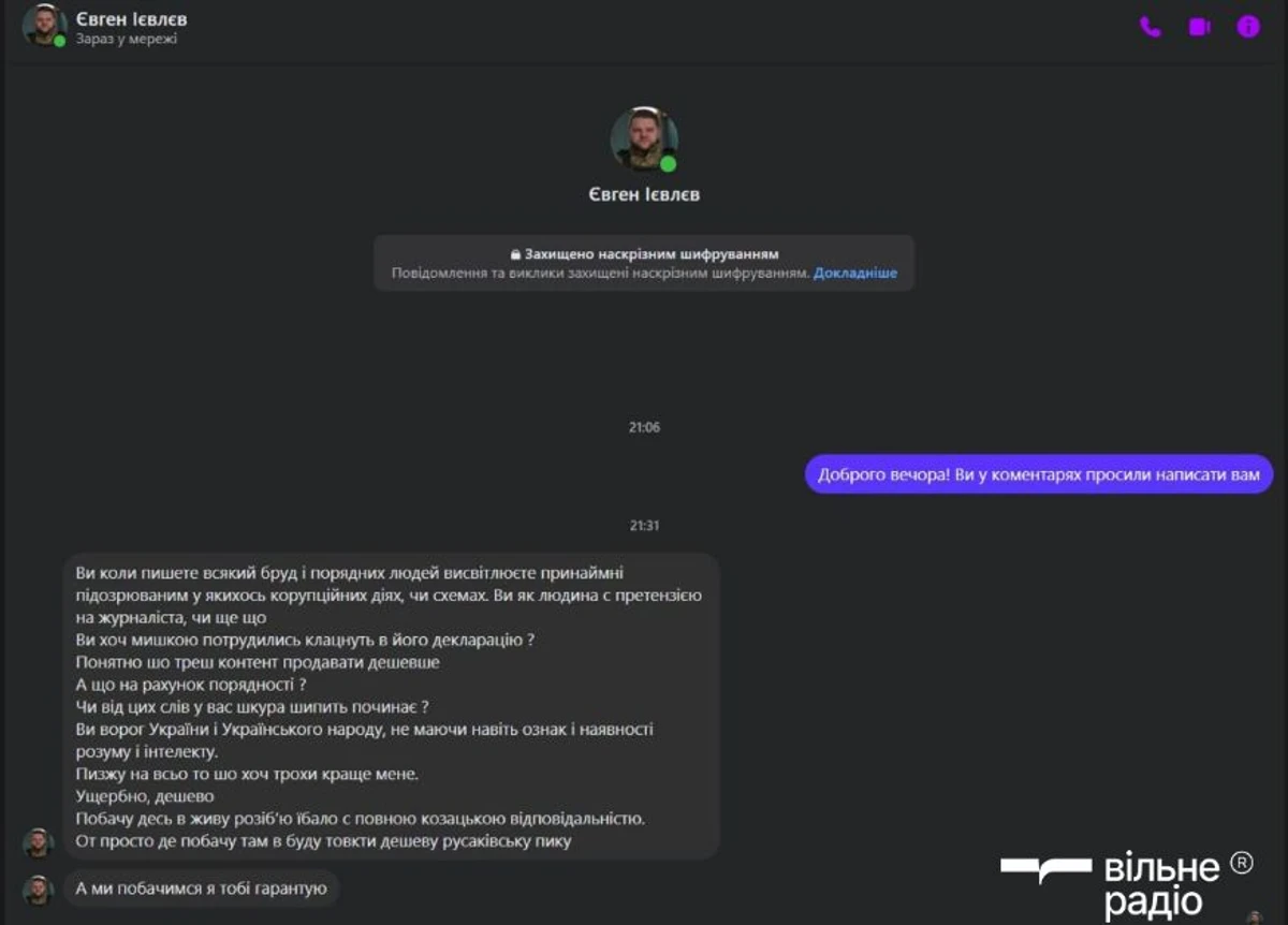 А-от погрози побиття журналіста – цілком. На початку травня 2025 журналіст "Вільного Радіо" Євген Вакуленко опублікував статтю про статки працівників ТЦК Донеччини за 2024 рік. Після виходу тексту Євген Ієвлєв, син одного з фігурантів розслідування, написав Вакуленку у Messenger: "Ви ворог України і Українського народу, не маючи навіть ознак і наявності розуму і інтелекту… Побачу десь в живу розіб’ю …ало с повною козацькою відповідальністю. От просто де побачу там в буду товкти дешеву русаківську пику. А ми побачимся я тобі гарантую".