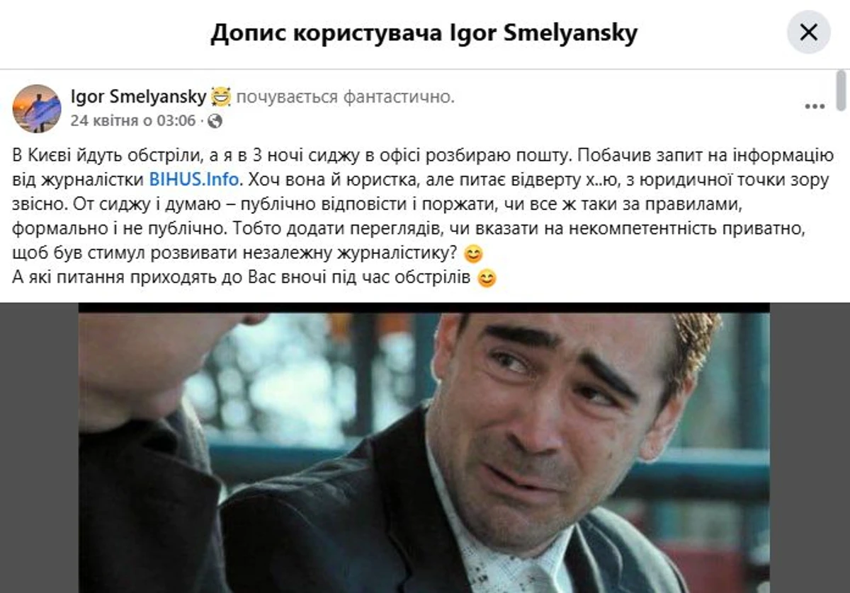 24 квітня 2025 керівник "Укрпошти" Ігор Смілянський публічно принизив працівницю розслідувального проєкту Bihus.info. У своєму персональному Facebook-акаунті він написав: "... я в 3 ночі сиджу в офісі розбираю пошту. Побачив запит на інформацію від журналістки BIHUS.Info. Хоч вона й юристка, але питає відверту х..ю, з юридичної точки зору звісно. От сиджу і думаю – публічно відповісти і поржати, чи все ж таки за правилами, формально і не публічно".