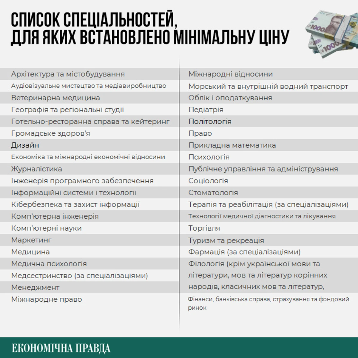 У 2025-2026 навчальному році мінімальну вартість навчання встановлять для 38 спеціальностей із 110, відштовхуючись від індикативної собівартості. Зокрема – для найпопулярніших спеціальностей: "Психологія", "Менеджмент", "Філологія", "Комп'ютерні науки" та "Право". У владі ці п'ять напрямків називають "кон'юнктурними", тобто якими перенасичений ринок праці.