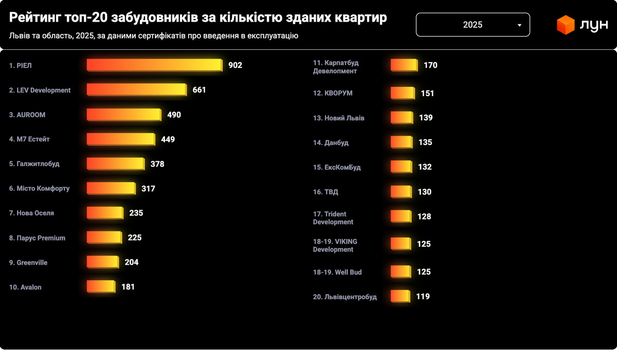 Компанія LEV Development посіла друге місце у рейтингу девелоперів Львова та області за кількістю зданих квартир у 2025 році за версією ЛУН. Рейтинг підготували у межах спеціального проєкту разом із NV на основі сертифікатів про введення житла в експлуатацію.