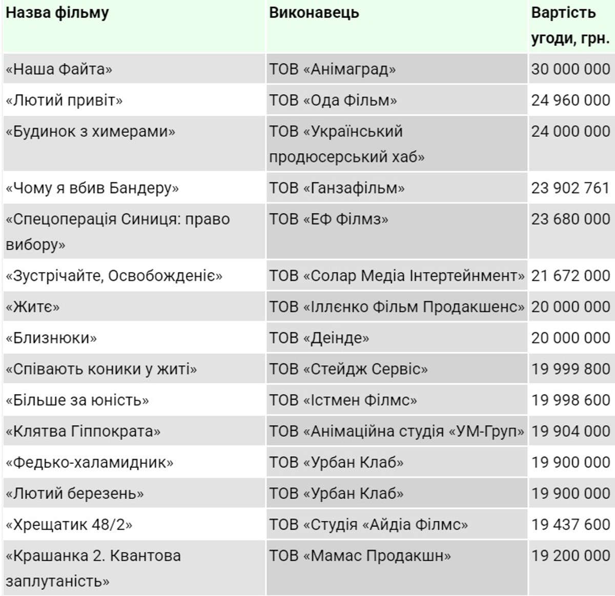 Як пише видання, найбільшу суму отримало ТОВ "Анімаград" на повнометражний анімаційний фільм "Наша файта" – 30 млн грн.