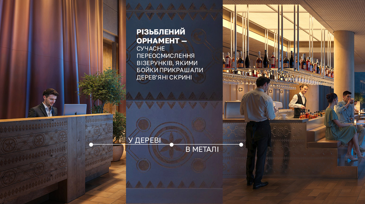 Металевий фасад лаунж-бару має різьблений орнамент — сучасне переосмислення візерунків, якими бойки прикрашали дерев'яні скрині. Конструкція бару розвертає гостей обабіч стійки до панорамних вікон — так, щоб кожен мав відкритий вид на гірські схили.