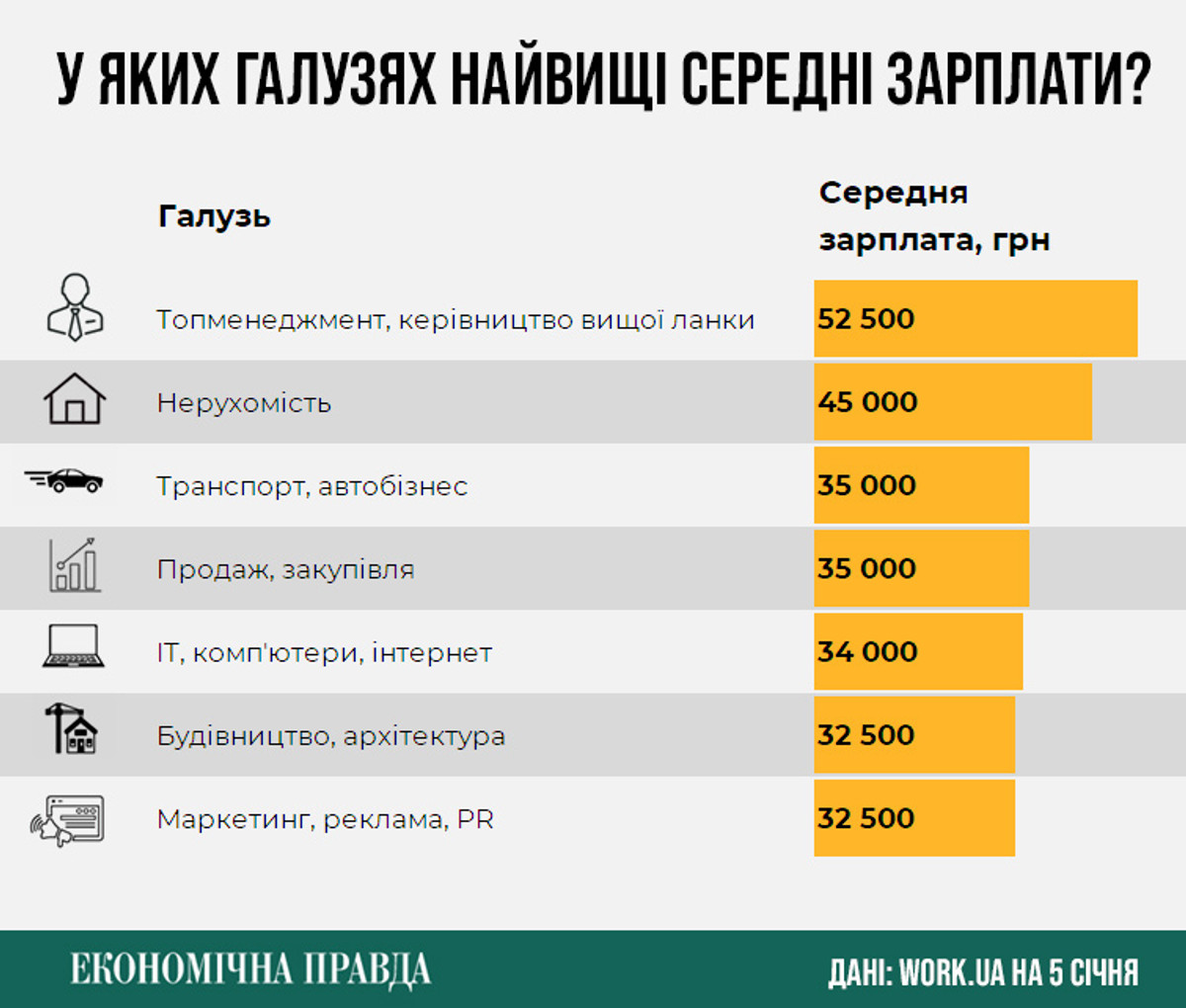 Загалом найвищі зарплати пропонують директорам з маркетингу (80 тис. грн), інженерам з підготовки виробництва (72 тис. грн), керівникам відділу продажів, backend-розробникам та фінансовим директорам (по 70 тис. грн).