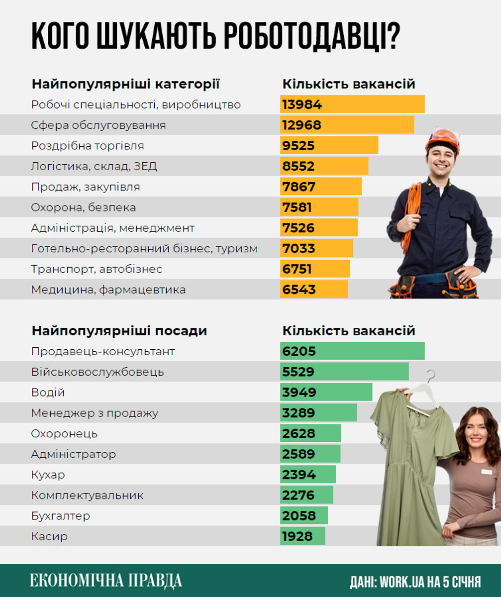 Третій рік поспіль перелік спеціальностей, за якими розміщується найбільше вакансій, не змінюється. Так, за даними агрегатора з пошуку роботи Work.ua, у січні 2026 року серед лідерів робітничі спеціальності, сфера обслуговування та торгівлі. Для перших високий попит пов'язаний з браком кваліфікованих кадрів, а на посади у сферах торгівлі та послуг характерна висока плинність кадрів.