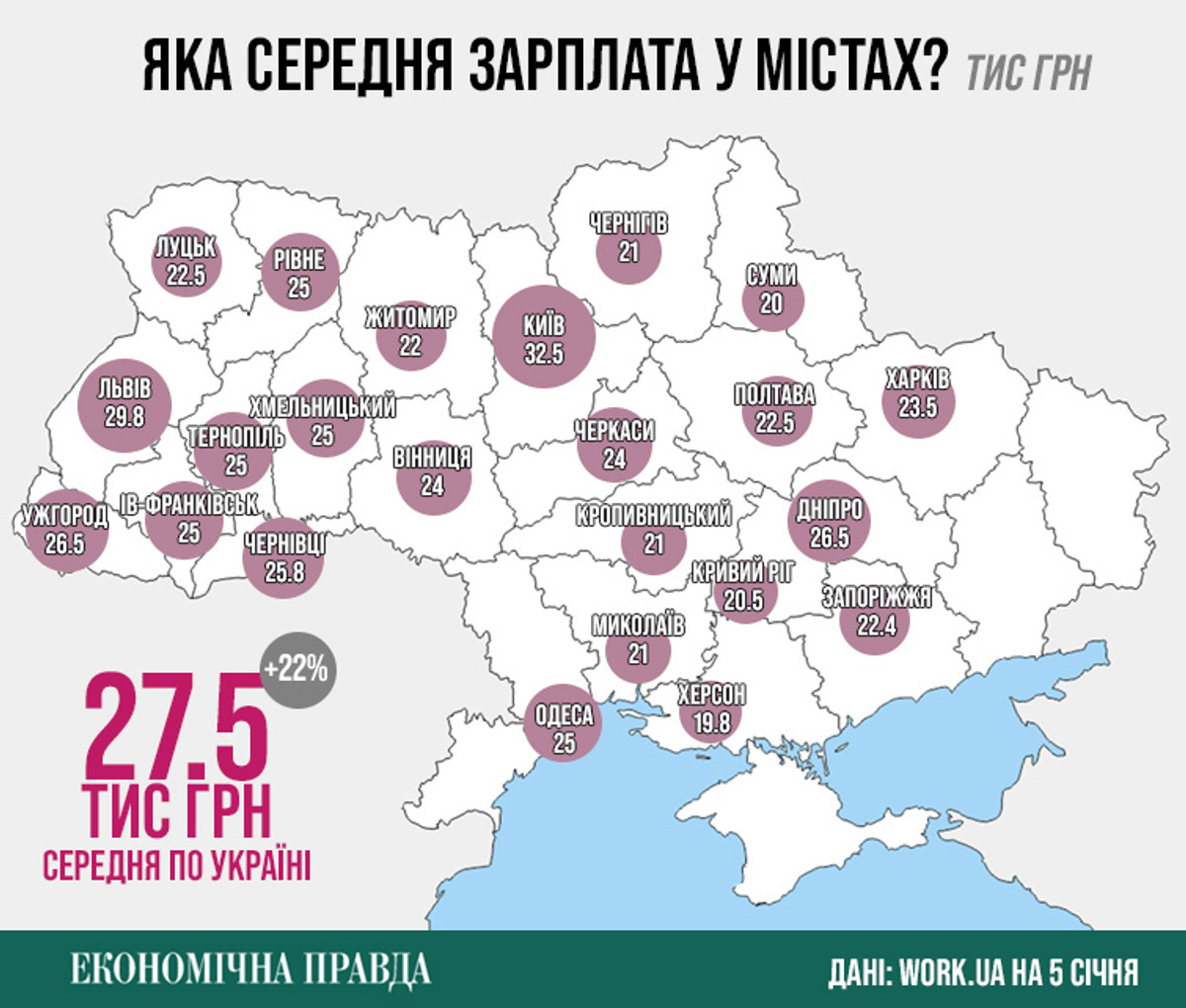 За даними Work.ua, найвищу зарплату традиційно пропонують у Києві – в середньому 32,5 тис. грн. Трохи менше – у Львові (29,8 тис. грн), Дніпрі та Ужгороді (по 26,5 тис. грн).