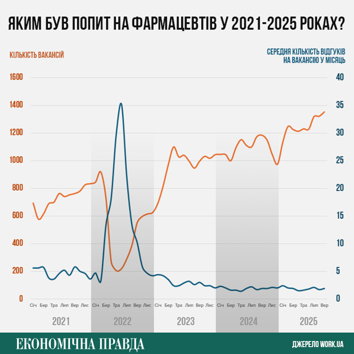 Наявність дефіциту кадрів для аптек підтверджують й агрегатори з пошуку роботи, наприклад Work.ua. За їх даними, попит на фармацевтів в останні роки зростає, а кількість відгуків на такі вакансії скорочується.