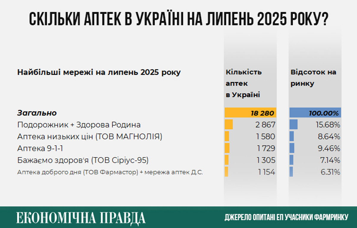 Причина проста: велика кількість закладів, де можна придбати ліки. За даними опитаних ЕП учасників ринку, у липні 2025 року в Україні працювали 18 280 аптек. Ця цифра в останні роки більш-менш статична: малі мережі десь скорочуються, великі – десь зростають.