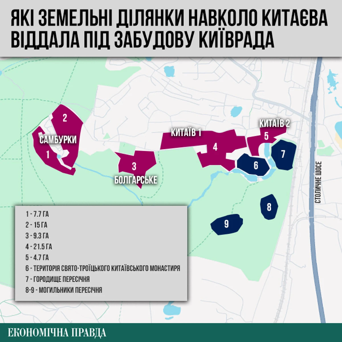 За часів керівництва Києвом Олександром Омельченком частина земель Китаєва та кілька сусідніх ділянок опинилися в приватних руках, а за Леоніда Черновецького ділянки не зовсім легально отримали цільове призначення "під забудову".