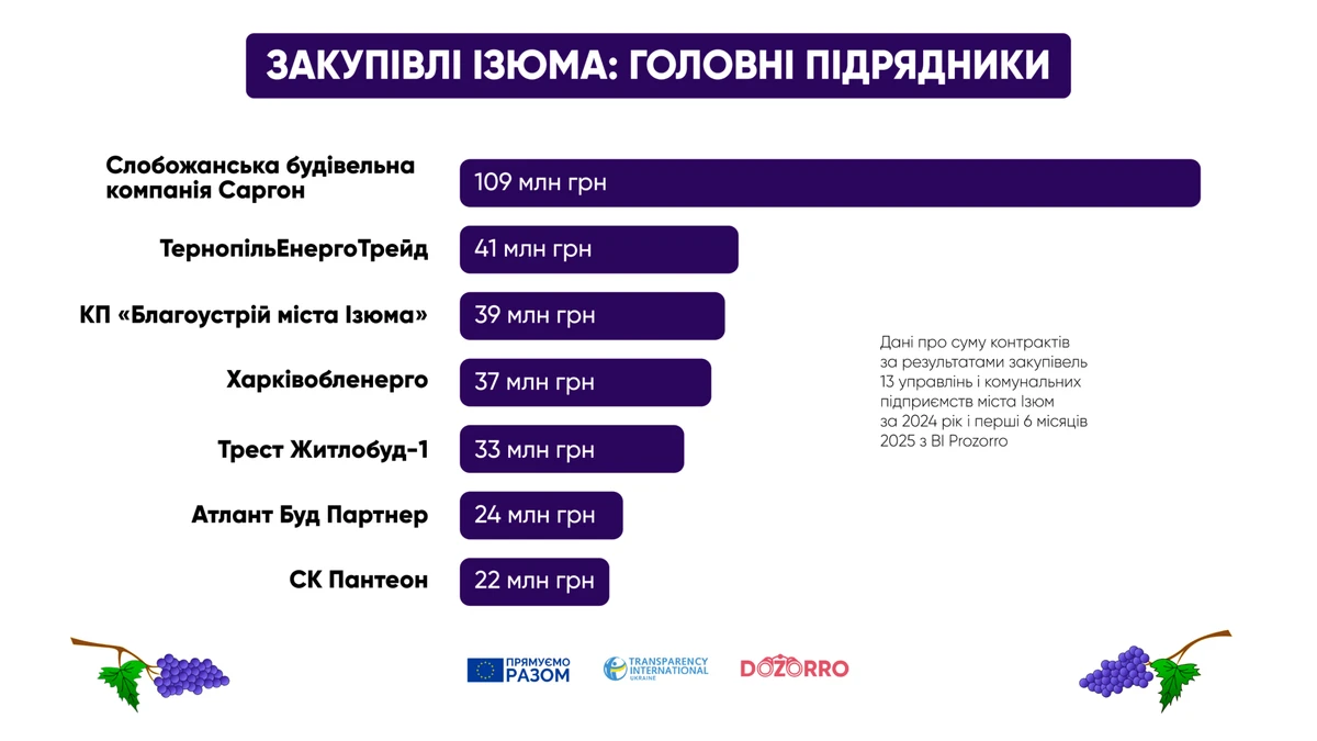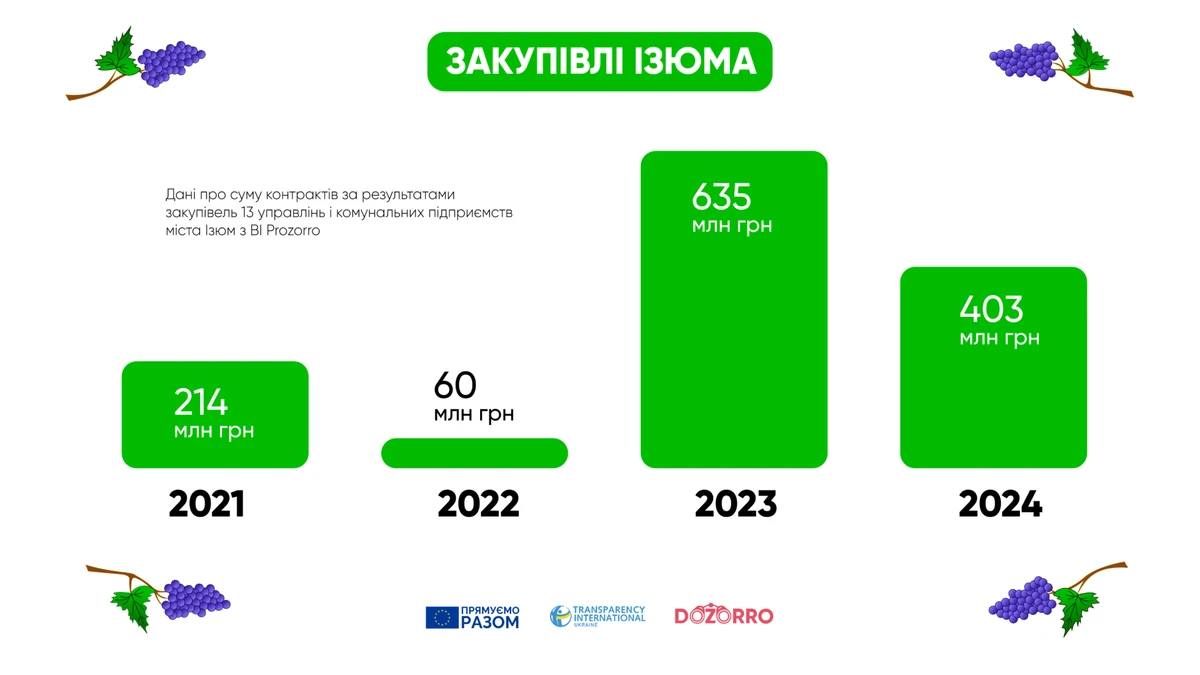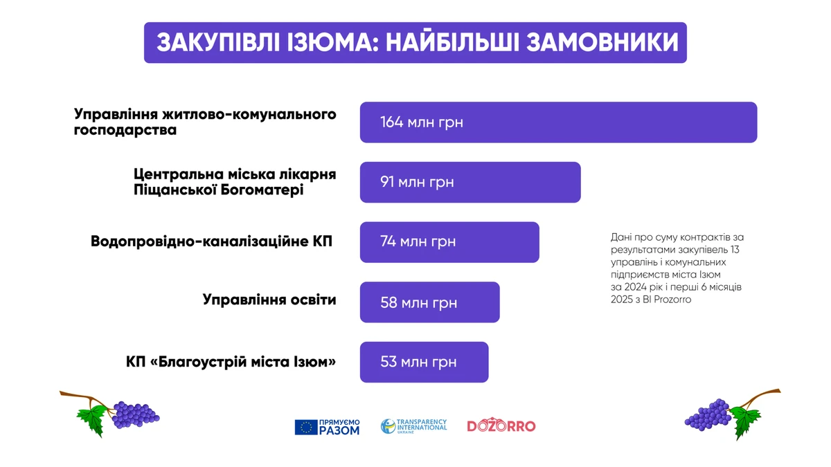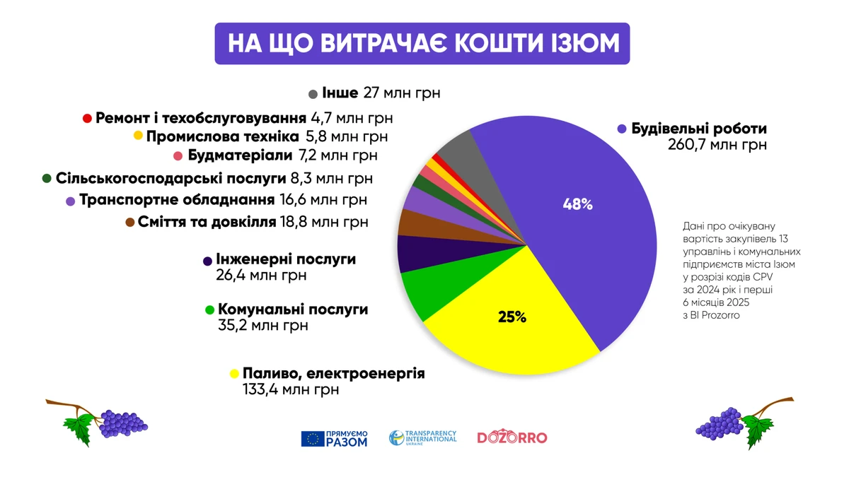 Проєкт Dozorro TI Ukraine проаналізував закупівлі 13 управлінь і комунальних підприємств Ізюма за 2024 рік та шість місяців 2025 року. Закупівлі – це індикатор того, як місто відновлюється, які пріоритети ставить та як розпоряджається коштами. Також дізнавалися про труднощі, з якими стикаються замовники.