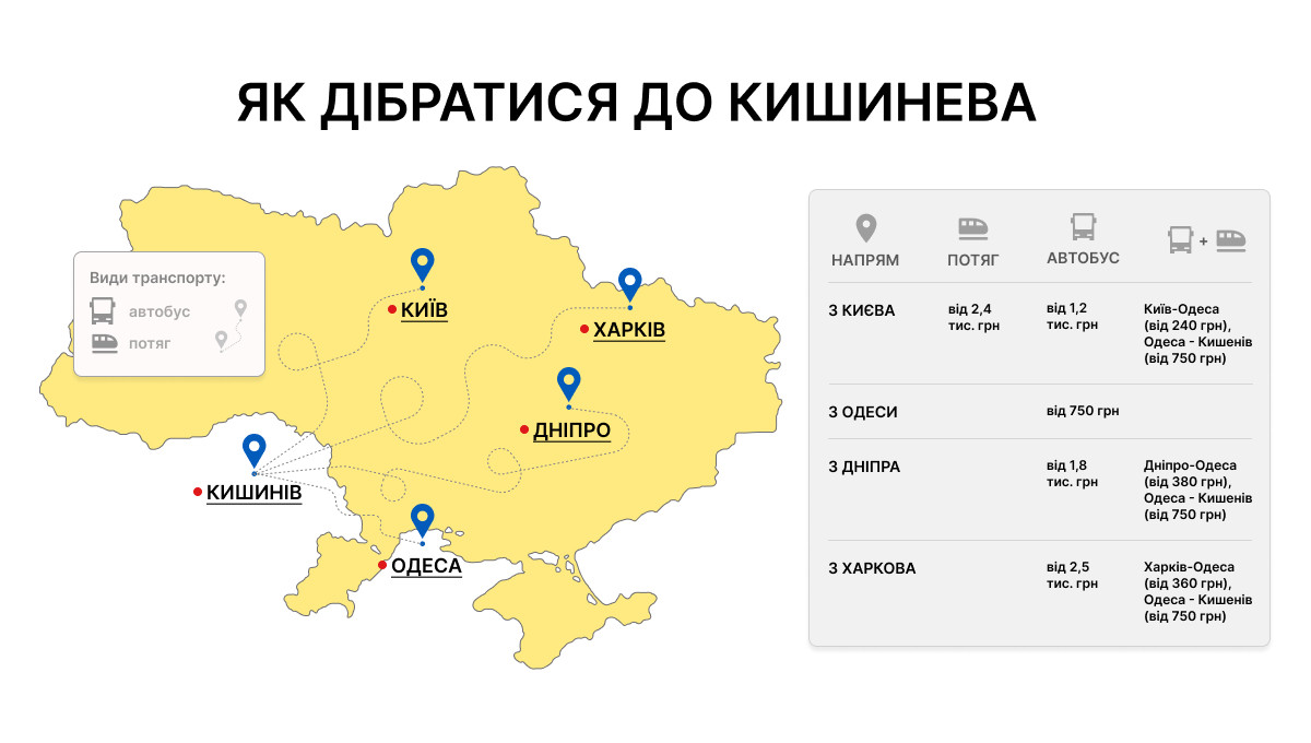Дістатися з України до Кишинева можна кількома способами: автобусом, потягом чи трансфером.