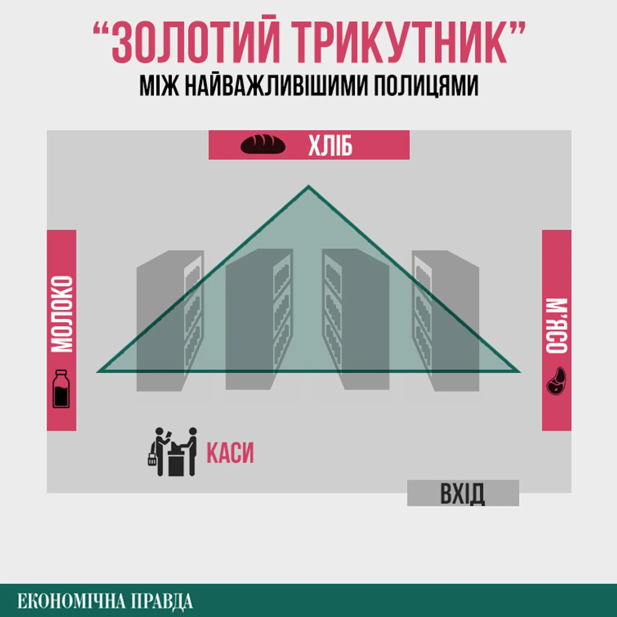 Товари першої потреби – хліб, молоко та м’ясо – часто навмисно розводять по різних кутах супермаркету. Такий прийом називають "правилом золотого трикутника". Завдяки цьому споживач у пошуках запланованих покупок пройде кілька рядів з іншими товарами. Це спонукає його до імпульсних витрат.