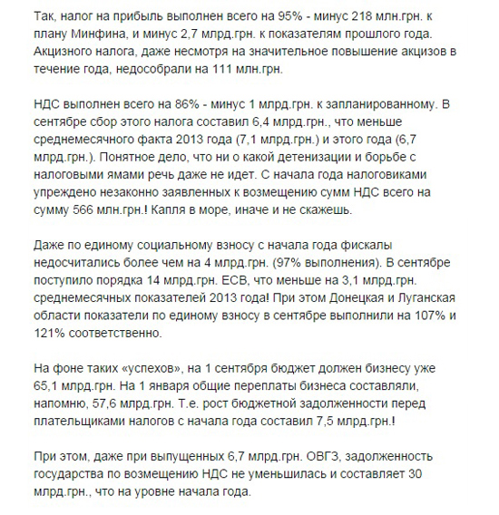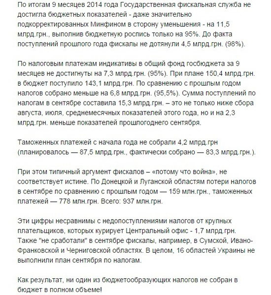 Незважаючи на девальвацію та інфляцію, податківці не можуть зібрати навіть суми, порівнянні з 2013 роком. Схеми не перекриті. Дивним чином забуті олігархи. Де Ляшко з його вилами? Де сміттєві баки під податковою? (Рос.)