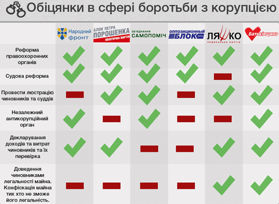 Люстрація чиновників та суддів залишається трендом. Більшість політичних сил декларують необхідність люстрації, однак "Народний фронт" та "Опозиційний блок", що представляють колишню та теперішню владу, не мають такого пункту.