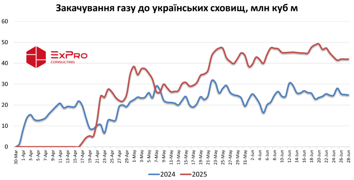 За 2,5 місяця, із 17 квітня по 27 червня, до сховищ закачано 2,6 млрд куб. м газу, що на 40% більше, ніж на цю дату 2024 року (з 31 березня по 15 червня).
