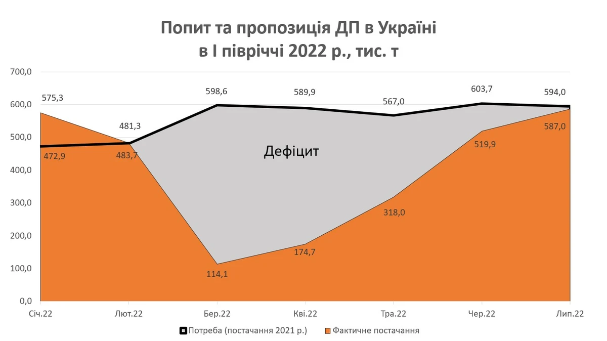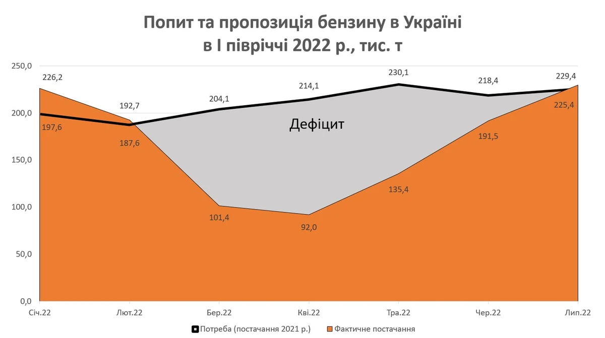 За нашими розрахунками, у березні-квітні 2022 року дефіцит бензинів становив 50% від потреби. По дизпальному в ці критичні місяці нестача сягала 80% від потреби.