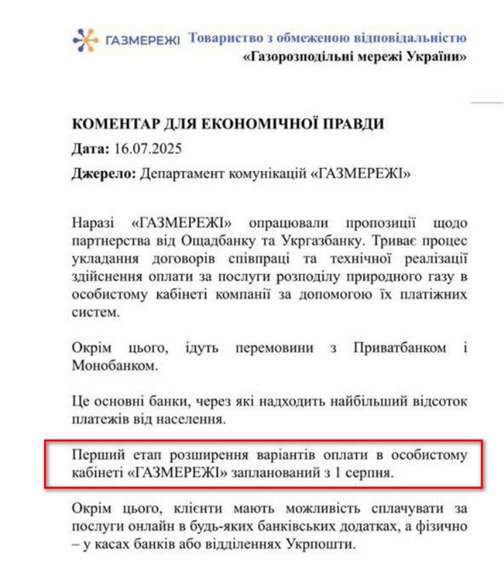 "Перший етап розширення варіантів оплати в особистому кабінеті "Газмережі" запланований з 1 серпня", - розповідали в компанії.