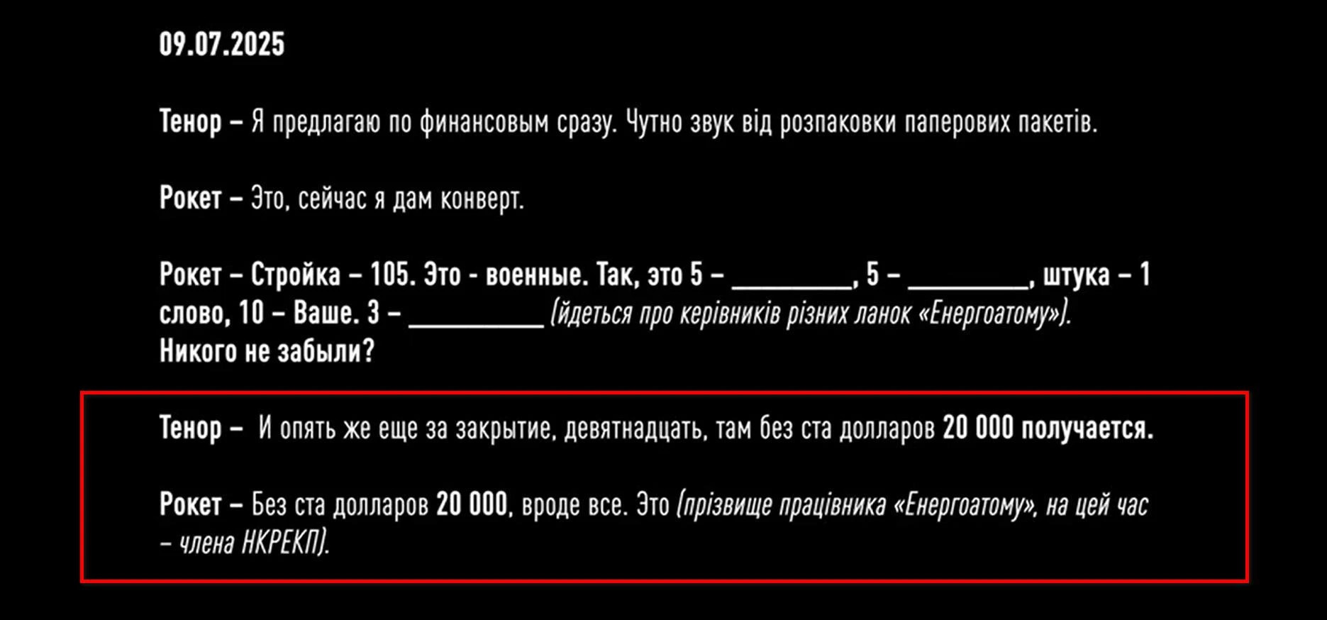 "Ще один фігурант плівок НАБУ – чинний член Національної комісії, що здійснює державне регулювання у сферах енергетики та комунальних послуг (НКРЕКП, – ЕП) Сергій Пушкар. Він фігурує у розмовах про передачу 20 тис. дол", - йдеться у тексті.