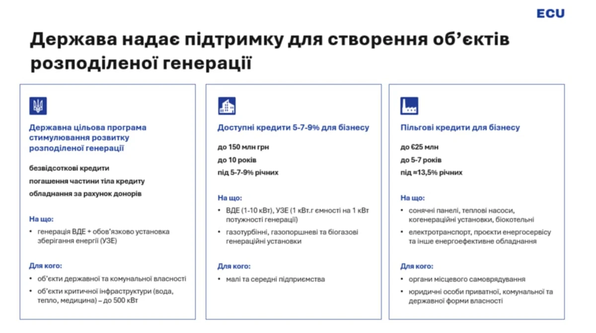 Виручити можуть банки, які в межах державних програм готові виділяти цільові кредити. Наша компанія співпрацює з державним Ощадбанком: допомагає громадам готувати енергетичні проєкти для простішого і швидшого отримання фінансування, приєднання і введення таких об’єктів в експлуатацію.