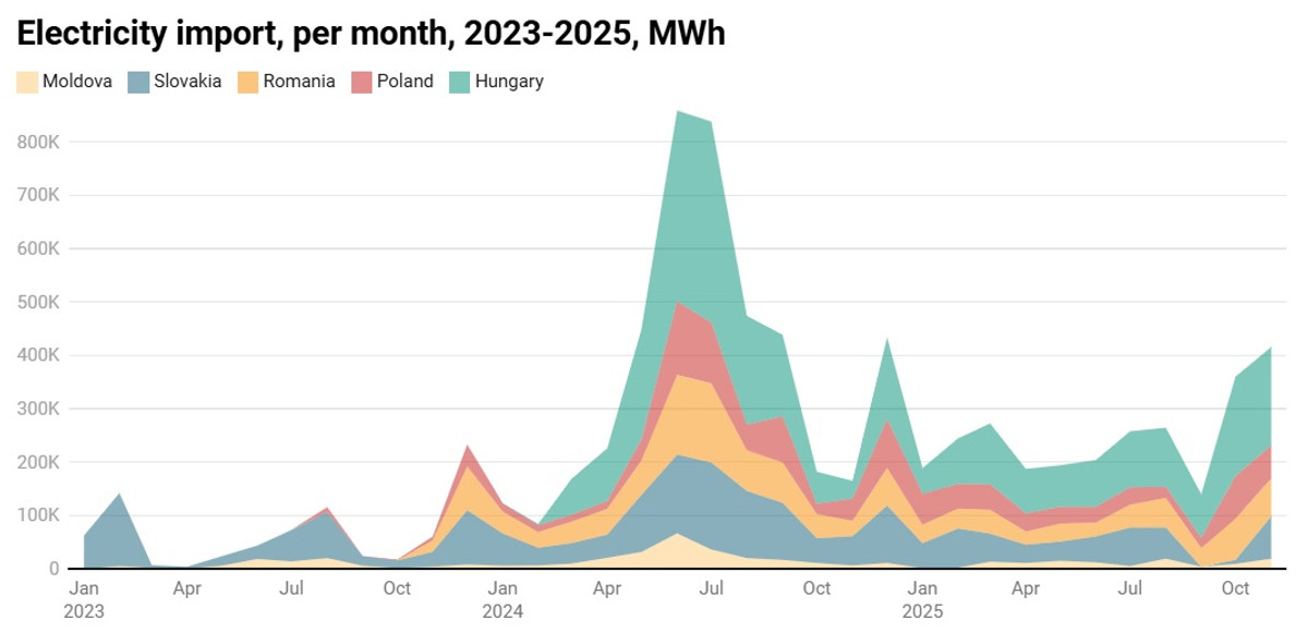Найбільшу частку і надалі займає Угорщина, 44%. У порівнянні з жовтнем 2025 року, різко зросли обсяги імпорту зі Словаччини, в 10 разів, та з Молдови – вдвічі.