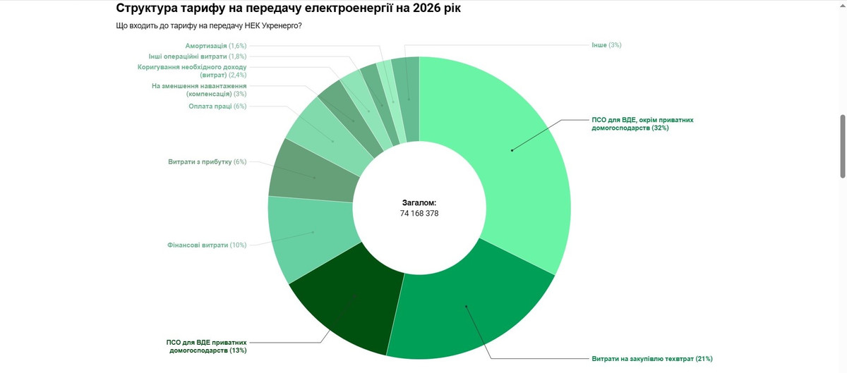 Усього необхідний дохід "Укренерго" на 2026 рік за новим тарифом оцінено приблизно у 74,17 млрд грн.