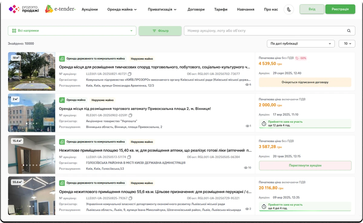 Якщо ви малий підприємець, який шукає, де відкрити торгове місце і як масштабувати бізнес, вам також у відкриті аукціони! Тут ви можете орендувати: