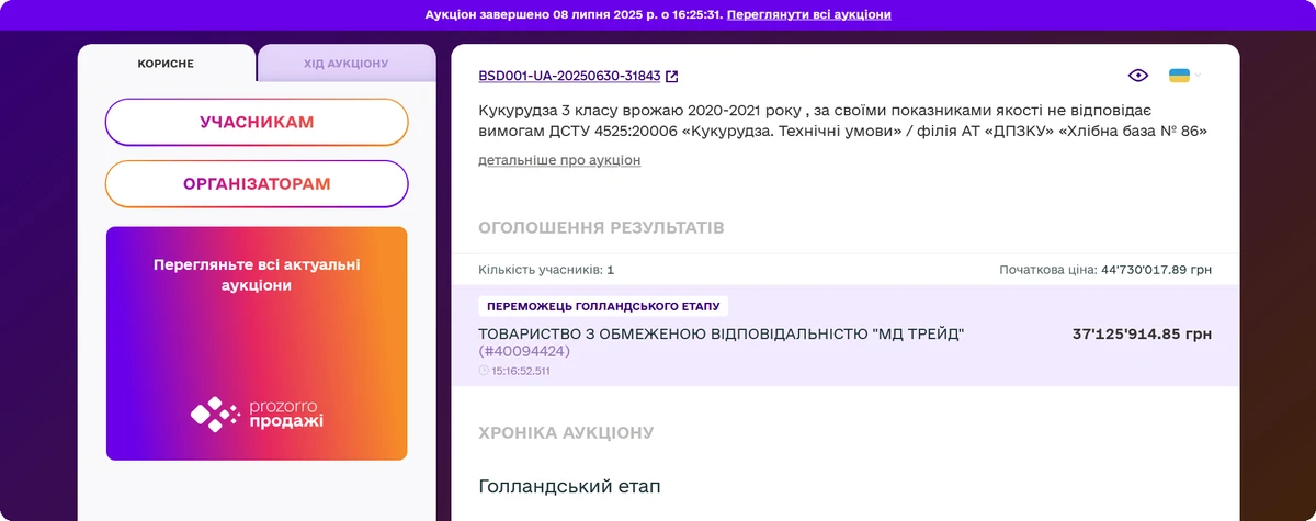 ТОВ "МД ТРЕЙД" придбала через прозорий аукціон 4 970 тонн кукурудзи. Здавалося б, складний і нетиповий ринок для відкритих аукціонів. Утім на базі акредитованого майданчика E-Tender, угоду вдалося провести "під ключ" — від пошуку об'єкта до вивантаження повного об'єму кукурудзи.