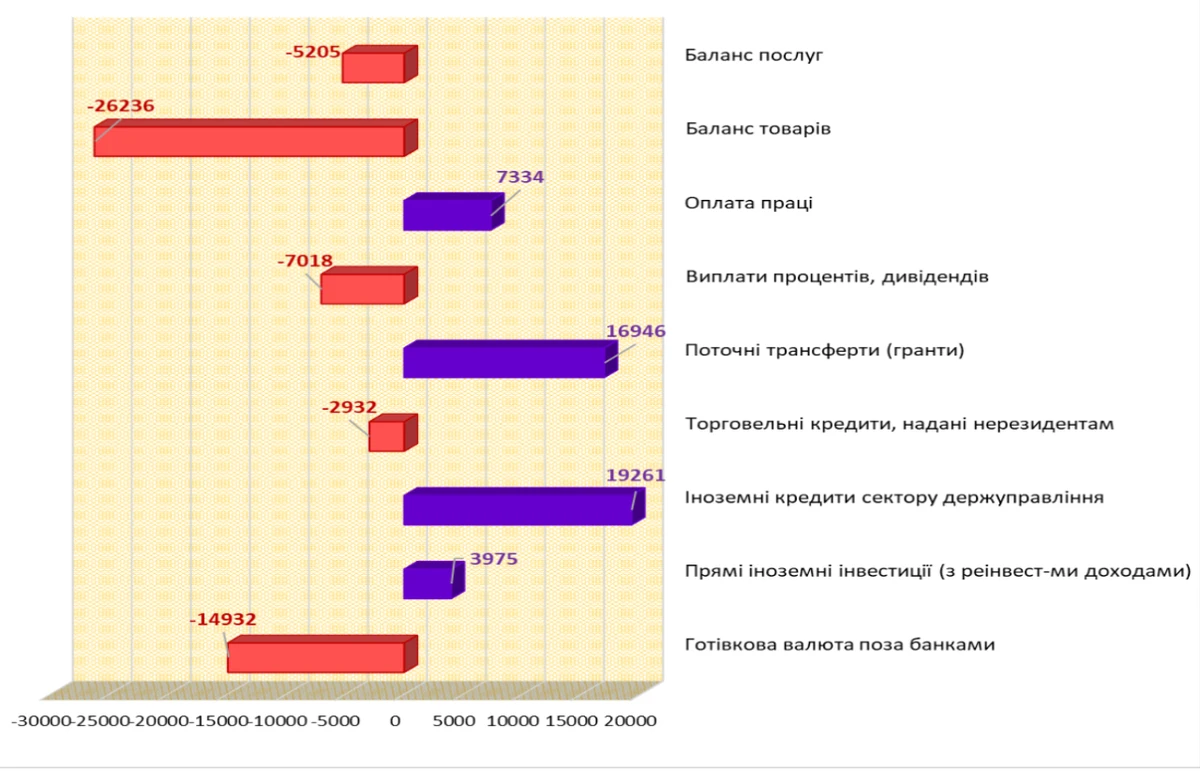 Основні складові поглиблення дефіциту поточного рахунку в минулому і наступному роках – це скорочення грантової та гуманітарної допомоги з-за кордону (на 4.4 млрд дол. у 2024 і на 10.3 млрд у 2025 році) разом із зменшенням доходів від оплати праці та тривалим нарощуванням потреб у товарному імпорті. Так, імпорт має зрости з 63.8 млрд дол. у 2023 до 81.5 млрд дол. у 2026 році.