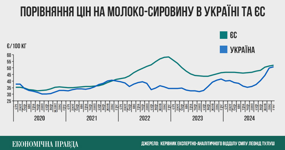 Зараз вартість сирого молока, яке становить близько 70% собівартості продуктів його переробки, перебуває майже на рівні ЄС – 50 євроцентів (22 грн) за літр. З червня по листопад 2024 року ціни на нього зросли на 35-40%, що вплинуло на собівартість готової продукції.