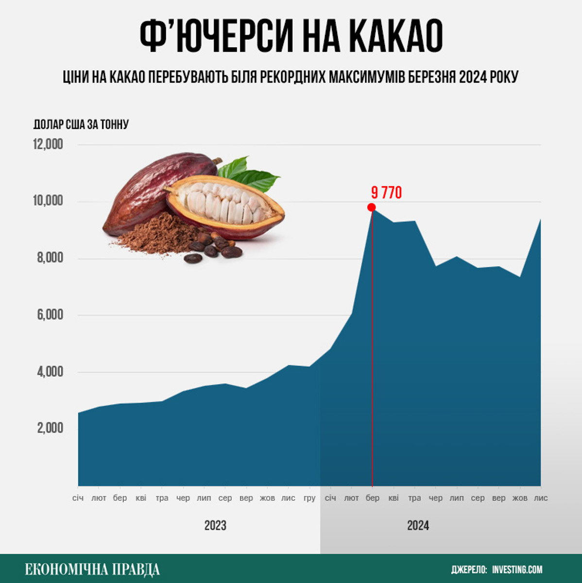 ЕП вже писала про зростання світових цін на основний складник кондитерських виробів – какао. І хоча влітку ціни трохи "охолонули", проте у листопаді вони знову пішли вгору і перебувають біля березневого рекорду 2024 року.