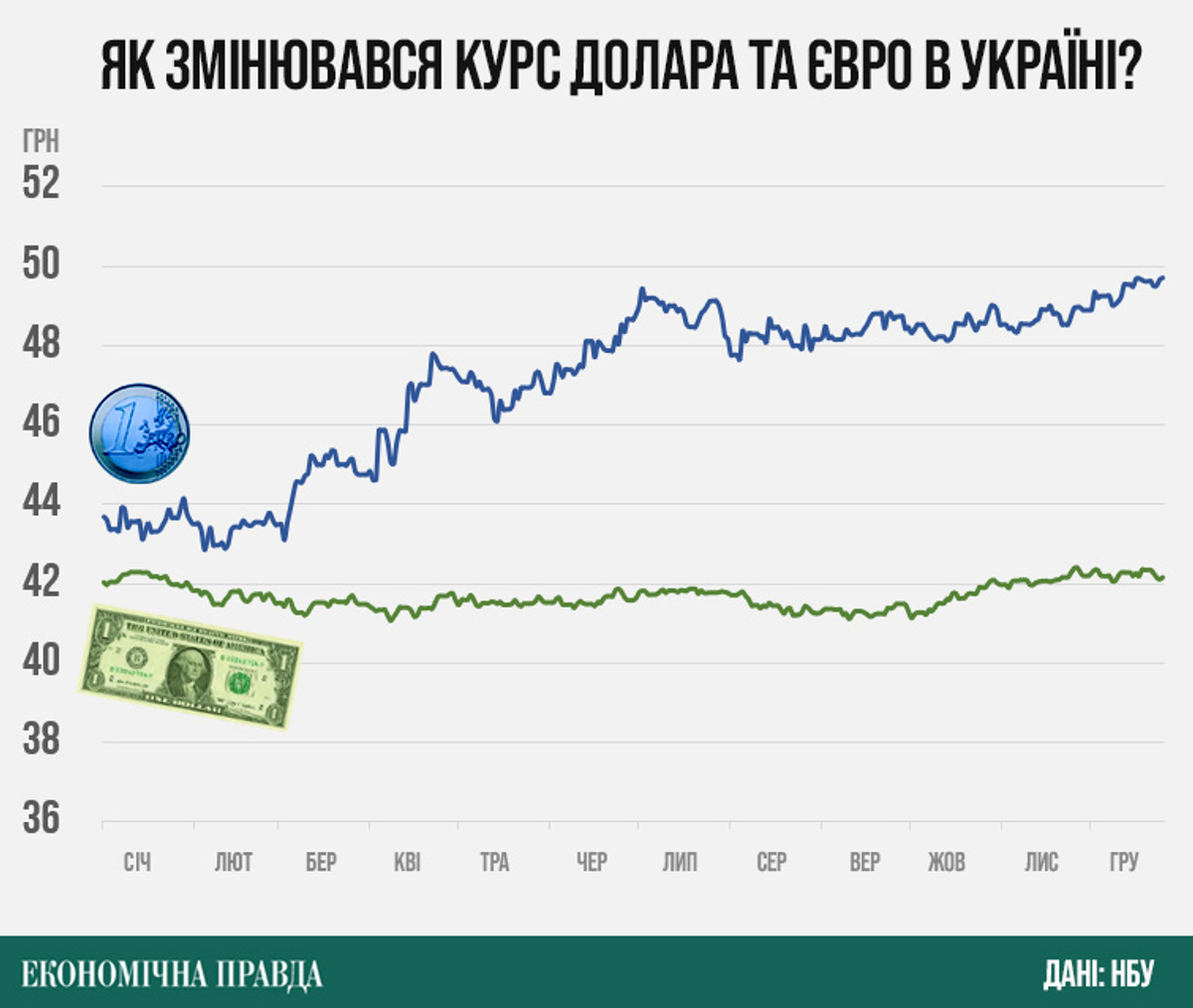 Хоча курс долара починав і закінчує рік на позначці близько 42 грн, девальвація все одно відбувається. Найяскравіше її демонструє зміна курсу євро із 43,6 грн на початку року до 49,6 грн наприкінці.