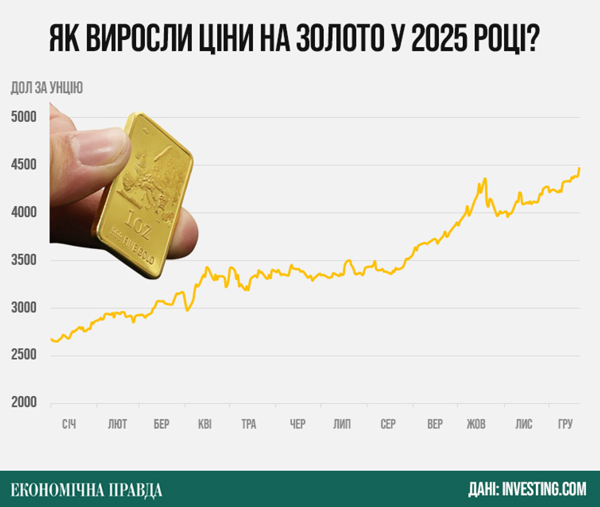 Водночас протягом року зростав попит на інші безпечні активи, зокрема золото. Підвищений попит сприяв рекордному зростанню цін: за рік тройська унція (31,1 грама) подорожчала на понад 66%, уперше перевищивши 4,5 тис. дол.