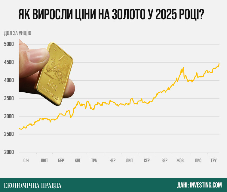 Водночас протягом року зростав попит на інші "безпечні" активи, зокрема золото. Підвищений попит сприяв рекордному зростанню цін: за рік тройська унція (31,1 грама) подорожчала на понад 66%, вперше перевищивши 4,5 тис. дол.