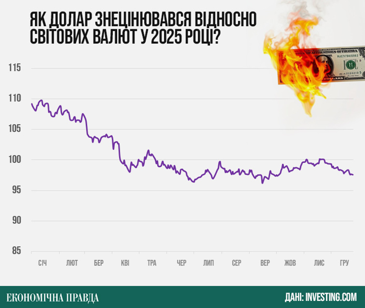 2025 рік став роком "слабкого" долара. На початку другого терміну президента Дональда Трампа та завдяки його політиці американська валюта знецінилася на 10% відносно кошика з шести основних світових валют.