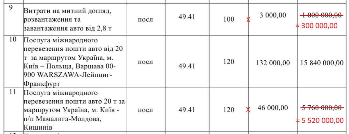 Як пише видання, у специфікації до договору по двох позиціях вказані помилкові суми. Витрати на митний догляд, розвантаження та завантаження для авто 2,8 т замовили в обсязі 100 послуг по 3 000 грн. Це дає 300 000 грн, а не 1,00 млн грн. Перевезення із Києва в Кишинів (Молдова) на авто 20 т замовили в обсязі 120 послуг по 46 000 грн. Це дає 5,52 млн грн, а не 5,76 млн грн.