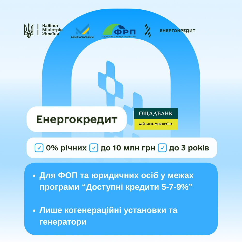 Підприємці можуть отримати через Ощадбанк пільговий кредит під 0% річних у межах державної програми "Доступні кредити 5-7-9%" на придбання та підключення енергетичного обладнання. Програма спрямована на підтримку малого й середнього бізнесу, для якого стабільне електропостачання є критично важливим.