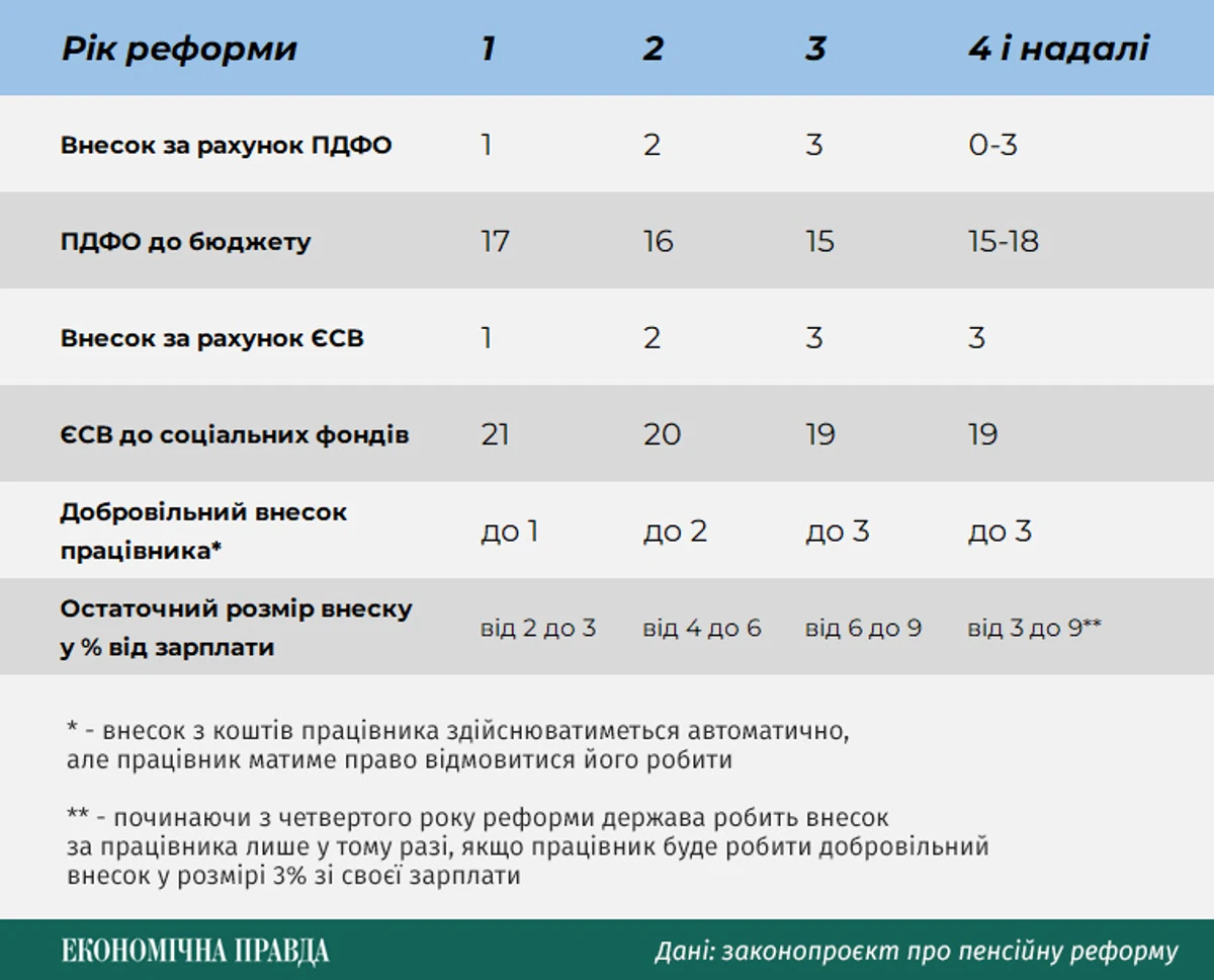 У перший рік після реформи внесок до накопичувального фонду становитиме 2-3% від зарплати: по 1% за рахунок відповідного зменшення ЄСВ та ПДФО, а ще 1% – добровільний внесок працівника. Щоправда, останній добровільним є лише умовно, адже стягуватиметься автоматично, проте працівник матиме право від нього відмовитися. Для цього потрібно буде пройти певні бюрократичні процедури.