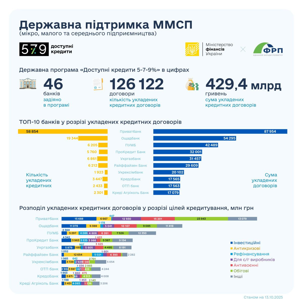 Зокрема, банки державного сектору видали 299 кредитів на суму 0,7 млрд грн. Від початку 2025 року представники мікро, малого та середнього бізнесу отримали за програмою 21 665 кредитів на загальну суму 63,3 млрд грн, з яких понад половину – від державних банків (15 036 кредитів на 31,4 млрд грн).