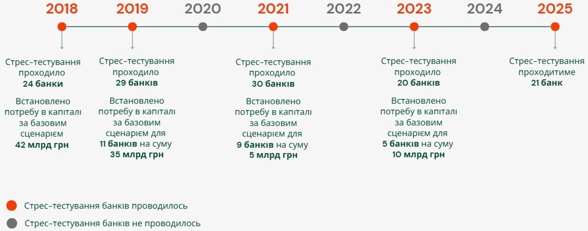 У 2023 році підхід до стрес-тестування був м’яким: оцінка базувалася на офіційному макроекономічному прогнозі НБУ без урахування можливих нових криз. Проте навіть за такого підходу пʼять банків ("МТБ банк", "Правекс банк", "Сенс банк", Укргазбанк та Укрексімбанк) потребували докапіталізації на 10 млрд грн загалом, яку покрили переважно завдяки поточним прибуткам. У 2024 році стрес-тестування не проводили, а цьогоріч стрес-тестування повертається і стає більш жорстким, включаючи два етапи: базовий та несприятливий прогнози.