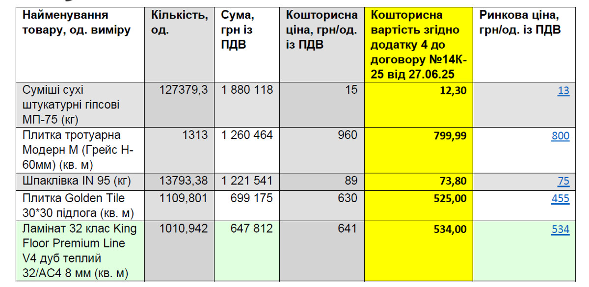 "Ця ж логіка стосується решти позицій, описаних в матеріалі та поданих в підсумковій таблиці. Стовпчик "ймовірна переплата", в результаті корегування даних у стовпчику з цитуванням цін з Договору №14К-25 від 27.06.25 має бути виправленим", – зазначено у публікації.