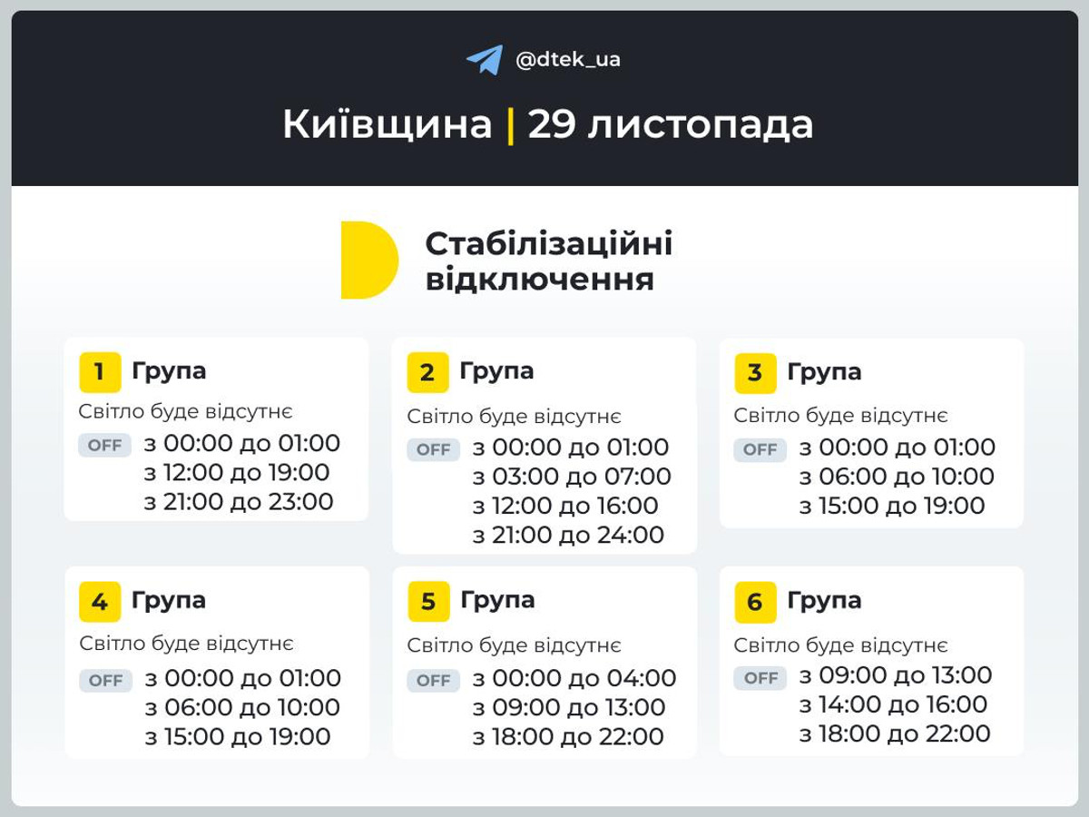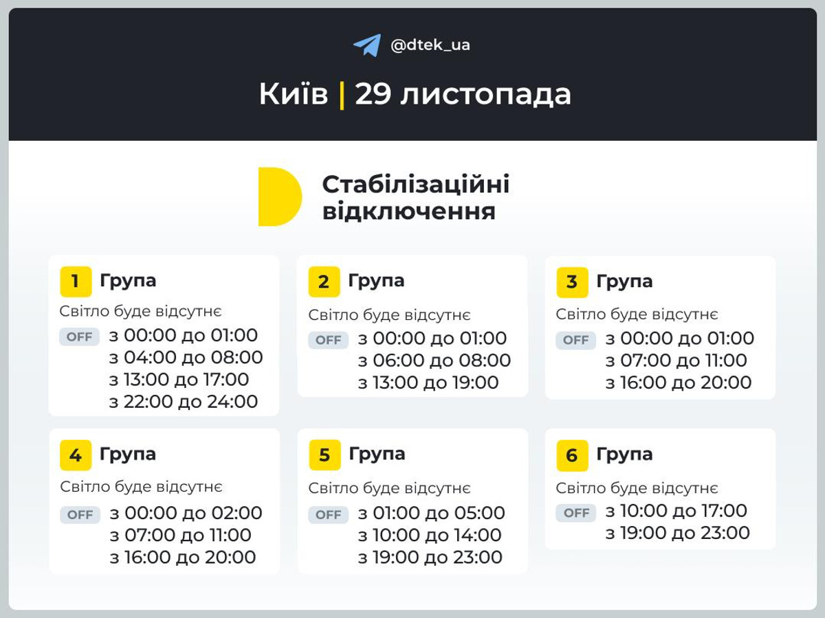 "ДТЕК" оприлюднила графіки відключень світла у Києві, Київській та Одеській областях 29 листопада.