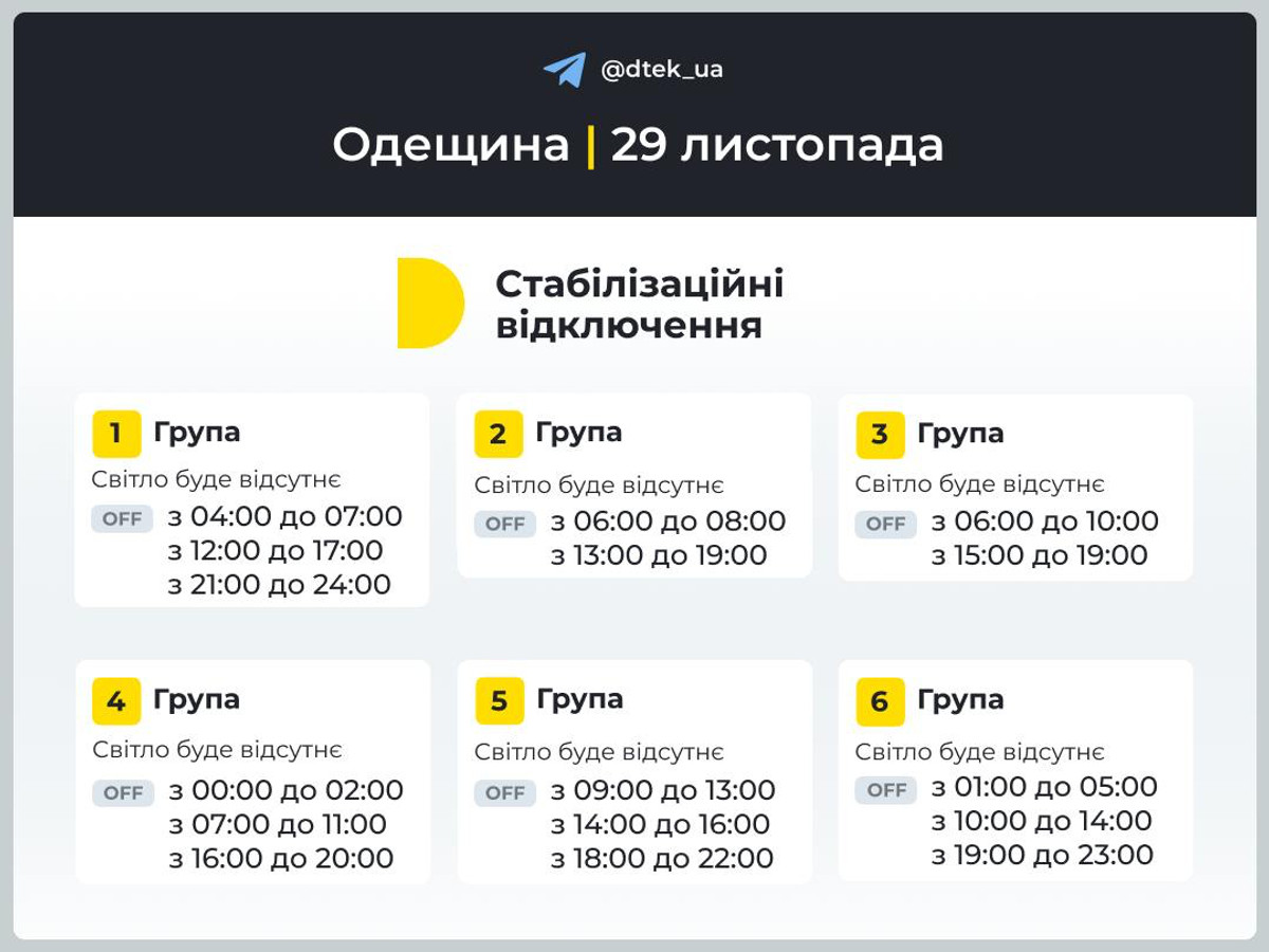 5 група: світла не буде з 00:00 до 04:00, з 09:00 до 13:00 та з 18:00 до 22:00.