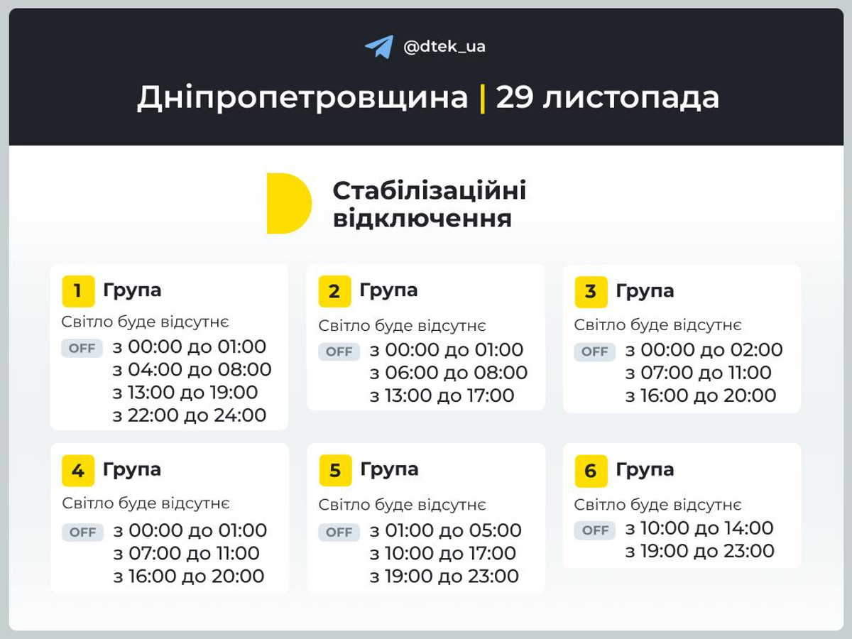 6 група: світло буде відсутнє з 01:00 до 05:00, з 10:00 до 14:00 та з 19:00 до 23:00.