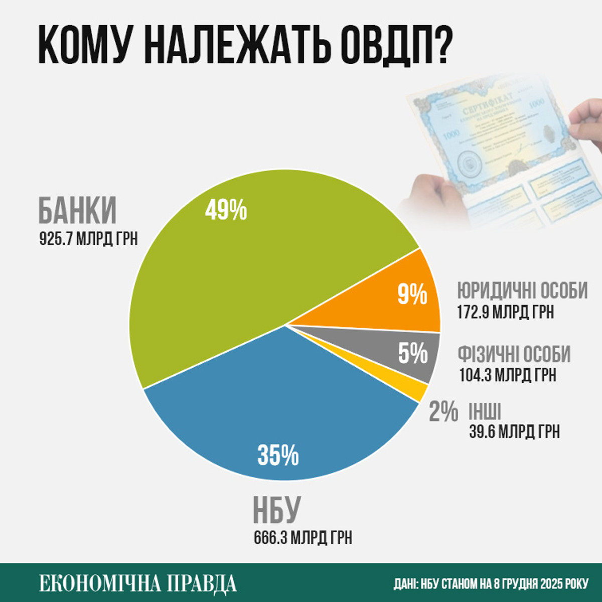 Платежі за державним боргом дійсно стали однією з найбільших статей видатків. У 2026 році уряд планує витратити 656,8 млрд грн на його погашення та 513,1 млрд грн – на виплату процентів. Попри те, що більшість українського держборгу – перед зовнішніми кредиторами, проте майже всі пов'язані з ним платежі у наступному році будуть здійснюватися на користь власників ОВДП, а найбільшим тримачем цих паперів в Україні є Національний банк.