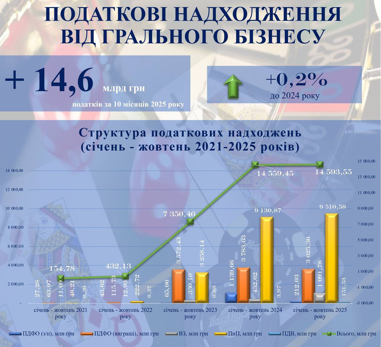 В Україні за 10 місяців 2025 року учасники ринку азартних ігор сплатили 14,6 млрд грн податків, що лише на 0,34 млрд грн або 0,2% більше, ніж за цей період 2024 року.