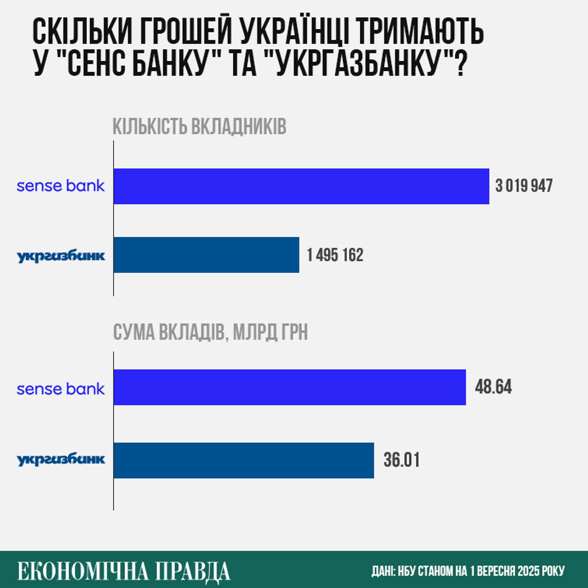 Акцент на роздрібному бізнесі дав свої плоди: вкладників у "Сенс банку" вдвічі більше, ніж в Укргазбанку (3,02 млн проти 1,49 млн). Загальна сума коштів українців у першому становить 48,6 млрд грн, у другому – 36 млрд грн.